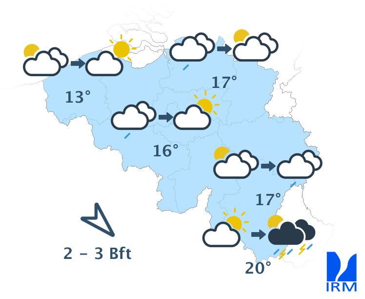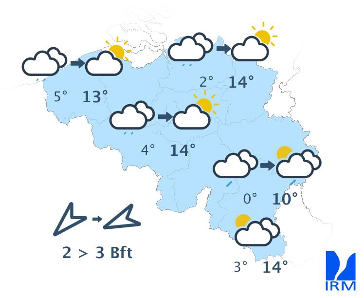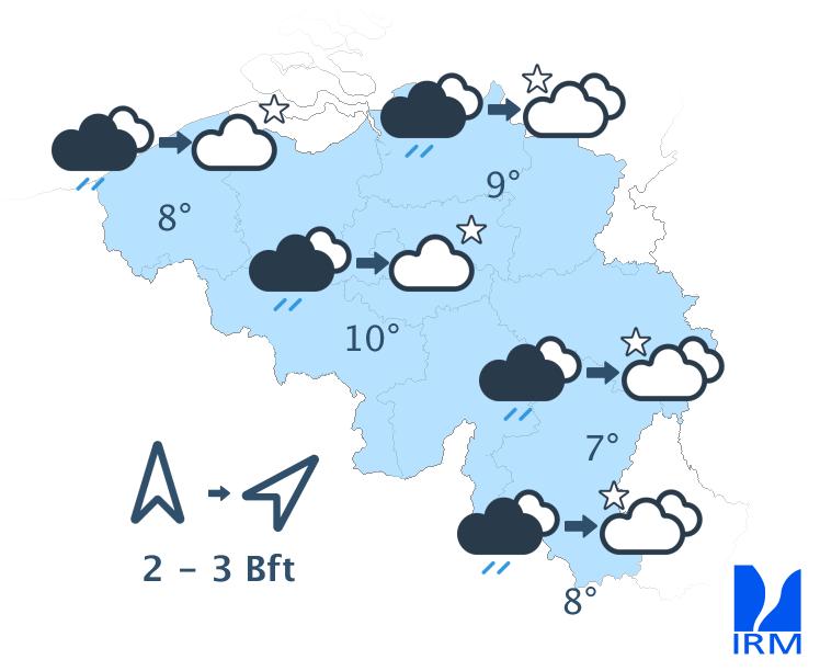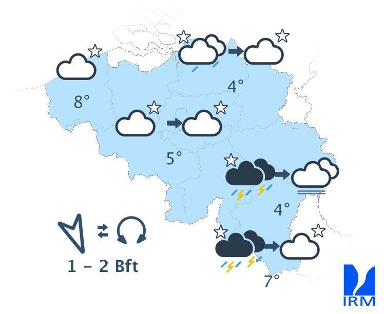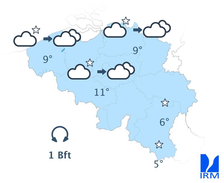 Vendredi soir, les éclaircies s’élargiront. La nuit suivante, la nébulosité deviendra abondante sur l’ouest et le centre avec la formation de nombreux nuages bas. En fin de nuit, quelques précipitations seront déjà possibles sur l'ouest. Les éclaircies persisteront par contre plus longtemps sur l’est et le sud-est du territoire. Les minima seront compris entre 5 et 11 degrés sous un vent faible de direction variable.