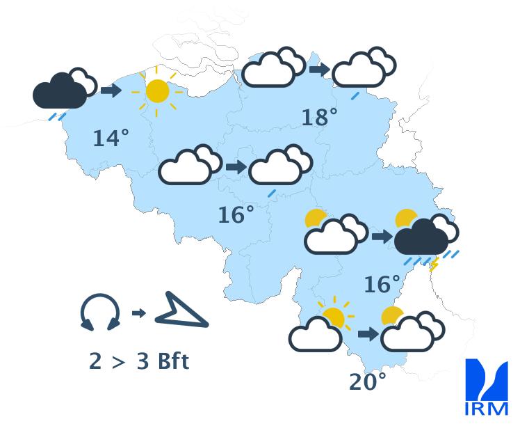 Samedi matin, une perturbation atteindra l'ouest et le nord-ouest du territoire et y donnera lieu à de faibles pluies. L'après-midi et en soirée, ces pluies toucheront aussi le centre et l'est du pays où elles pourraient devenir plus intenses (avec éventuellement quelques coups de tonnerre), alors que le temps sec sera de retour sur l'ouest avec possibilité d'éclaircies. Les maxima se situeront autour de 14°C à la côte, de 16 ou 17°C dans le centre et de 19°C en Lorraine belge, sous un vent souvent faible, d'abord de secteur ouest, virant ensuite au secteur ouest à nord-ouest.
