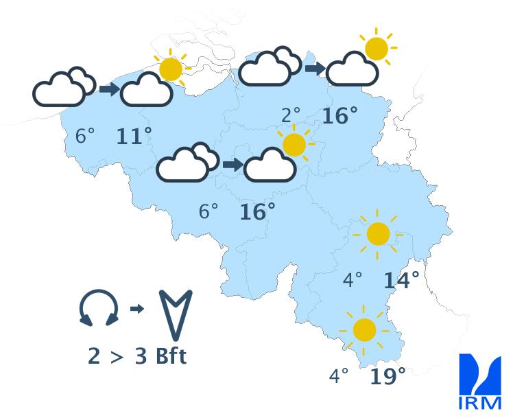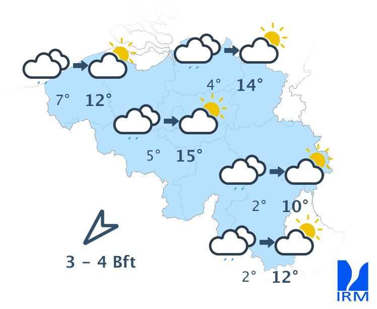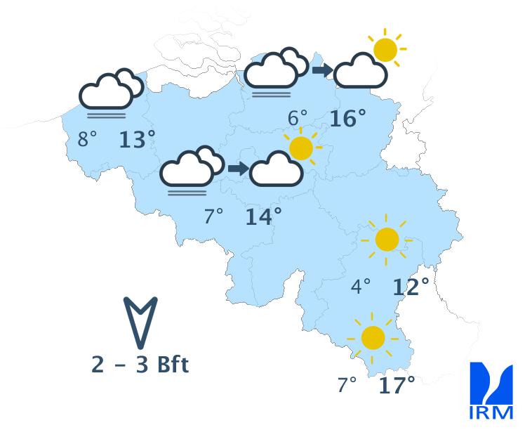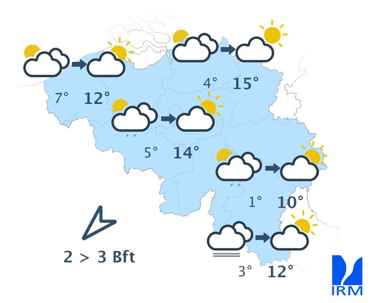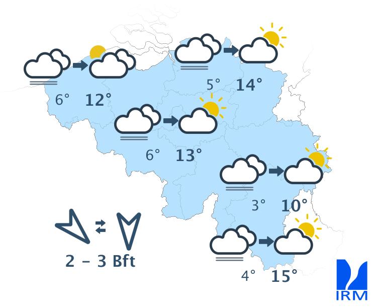 Mardi, la journée débutera avec un ciel très nuageux et éventuellement un peu de bruine. Par la suite, le temps deviendra sec et les éclaircies larges. Les maxima seront compris entre 10 degrés en Ardenne et 15 degrés dans le centre. Le vent sera modéré, et à la mer assez fort, de secteur nord-est.