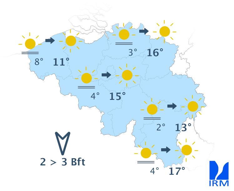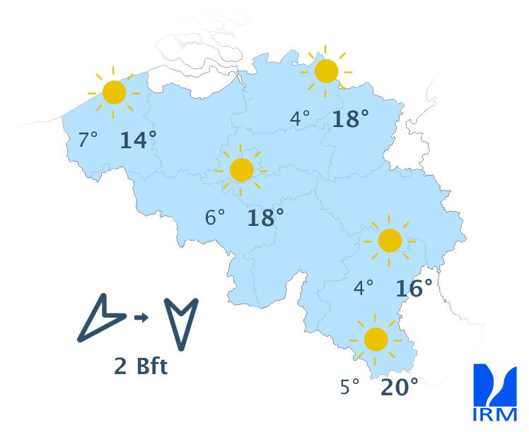 Mercredi, le soleil sera généreux et les maxima compris entre 13 degrés sur les hauteurs ardennaises et 18 degrés en beaucoup d'endroits dans l'intérieur des terres. Le vent sera faible à modéré d'est à nord-est.