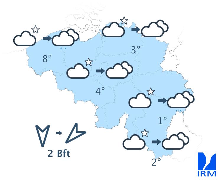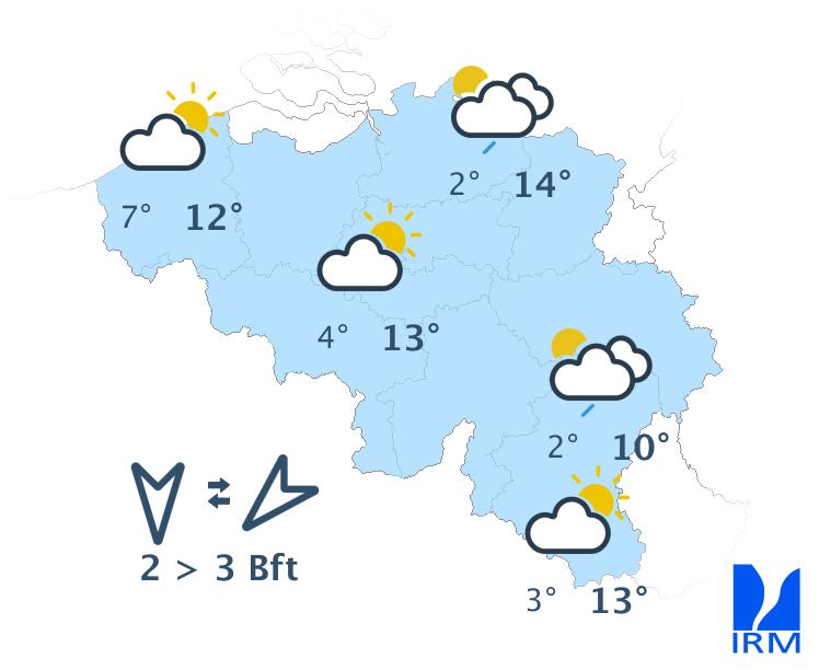 Ce soir, la tendance aux averses s'estompera et le ciel deviendra peu nuageux. Cette nuit, le temps deviendra brumeux et des nuages bas pourront se former. Sur les hauteurs de l'Ardenne, ils pourront d'ailleurs davantage limiter la visibilité par endroits. En fin de nuit, la nébulosité et le risque d'averses augmenteront en région côtière. Les minima s'échelonneront de 1 degré en Ardenne à 6 degrés à la mer. Le vent deviendra faible et virera au secteur nord à nord-est. Par endroits, de faibles gelées au sol seront possibles, surtout en Ardenne mais aussi en plaine sous les éclaircies persistantes.