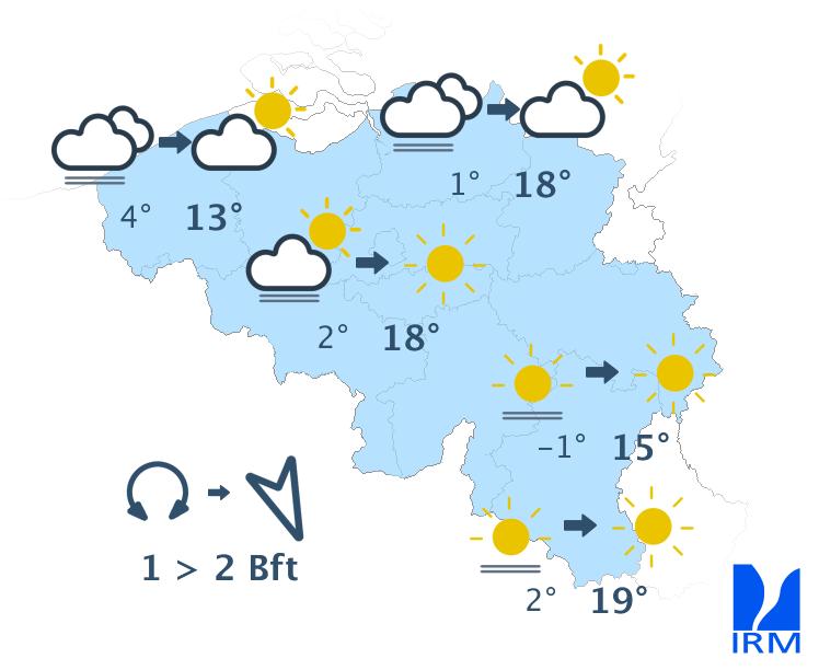 Mercredi, le temps sera ensoleillé avec des maxima de 12 ou 13 degrés en Hautes Fagnes à par endroits 18 degrés en Flandre. Le vent redeviendra rapidement modéré et à la mer modéré à parfois assez fort d'est à nord-est.