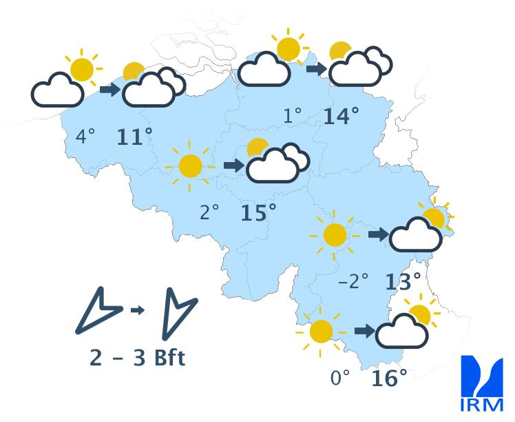 Ce soir et la nuit prochaine, les derniers champs nuageux se dissiperont ou s'évacueront vers la France, et le ciel se dégagera dans toutes les régions. Les minima varieront entre 0 ou -1 degré en Hautes Fagnes, 5 degrés dans le centre du pays et 6 degrés en bord de mer. Le vent sera faible à modéré d'est à nord-est.