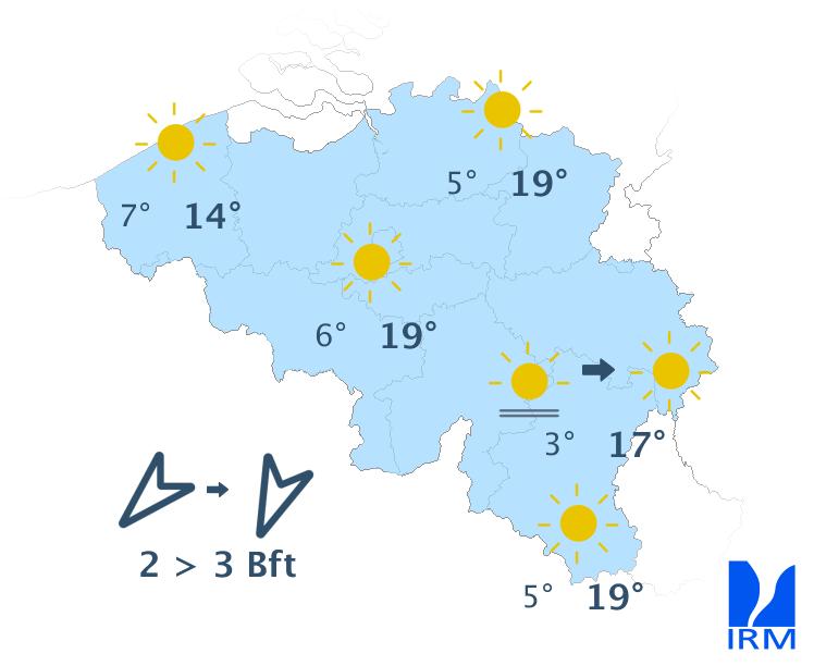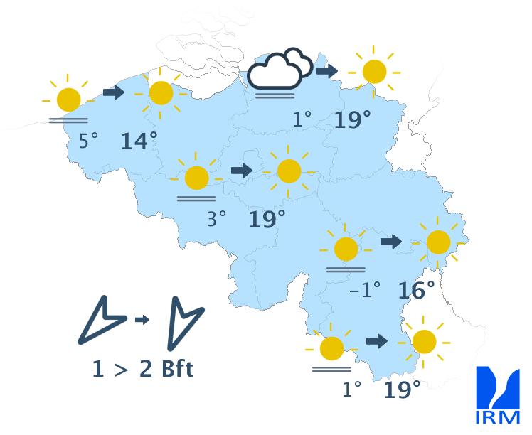 Jeudi, après une nuit assez fraîche, nous profiterons d'une belle journée ensoleillée avec un vent faible à modéré de nord-est. Dans l'intérieur des terres, les maxima seront compris entre 14 ou 15°C en Hautes-Fagnes et 18 ou 19°C en plaine ainsi qu'en Lorraine belge. A la côte, une brise de nord à nord-est se lèvera en cours de journée et y maintiendra les températures sous la barre des 14°C.