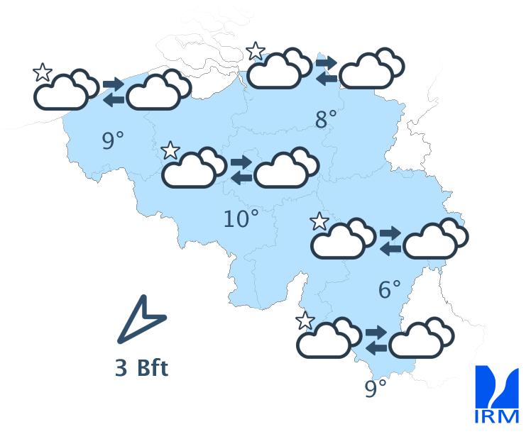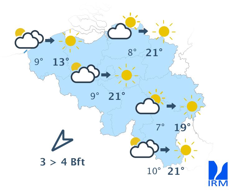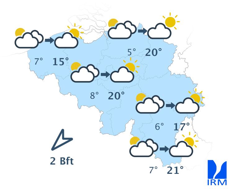 Mardi, la journée débutera avec une nébulosité variable et un temps généralement sec. Toutefois, sur l'ouest du pays, davantage de nuages seront présents avec le risque d'une ondée. En cours de journée, les éclaircies s'élargiront et le temps deviendra sec et ensoleillé partout. Les maxima se situeront entre 13 degrés en bord de mer et jusqu'à 21 degrés dans le centre. Le vent sera modéré de secteur nord-est. A la mer, il deviendra rapidement assez fort de nord-nord-est avec des rafales de l'ordre de 50 km/h.
