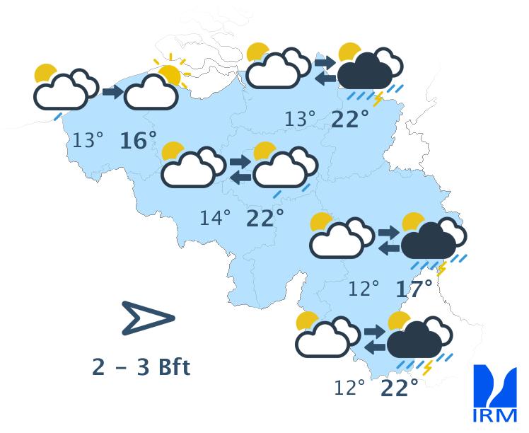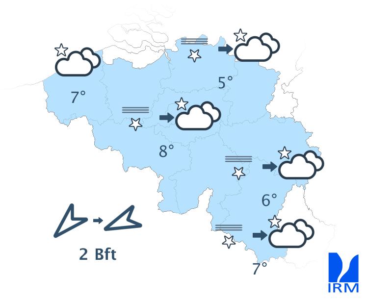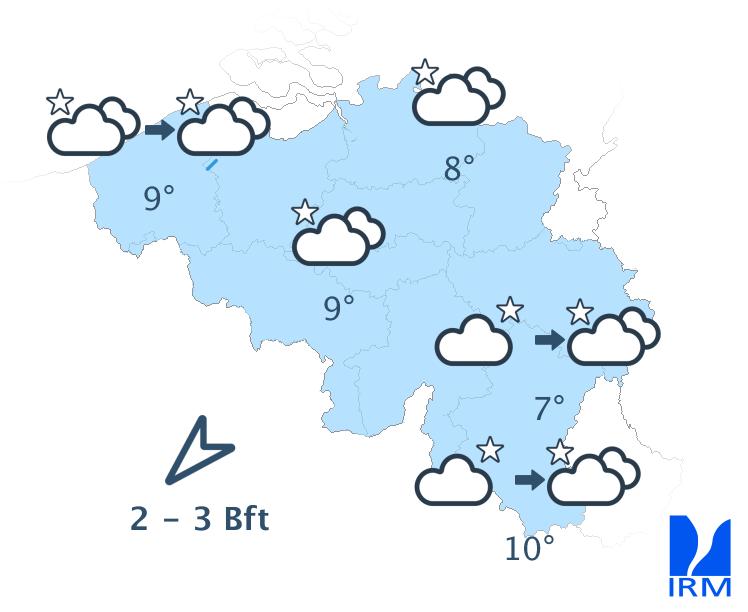 Ce soir et cette nuit, le ciel deviendra assez nuageux avec de nombreux nuages moyens et élevés. Le temps restera toutefois sec et les minima seront compris entre -1 degré dans certaines vallées de l'Ardenne et +7 ou 8 degrés dans les grandes villes ainsi qu'au littoral. Le vent deviendra faible d'est à nord-est ou même variable sur le sud-est du territoire.