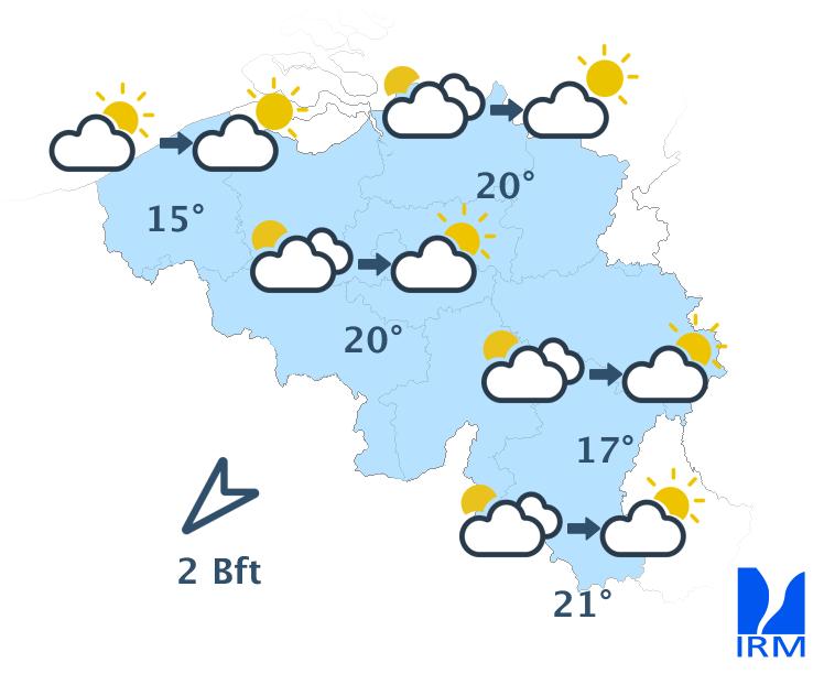 Mercredi, le temps sera ensoleillé et doux avec des maxima de 15 ou 16 degrés sur les hauteurs de l'Ardenne à 20 ou 21 degrés dans le centre. Le vent sera modéré de nord-est à est. A la côte, le vent de nord-est sera parfois assez fort.