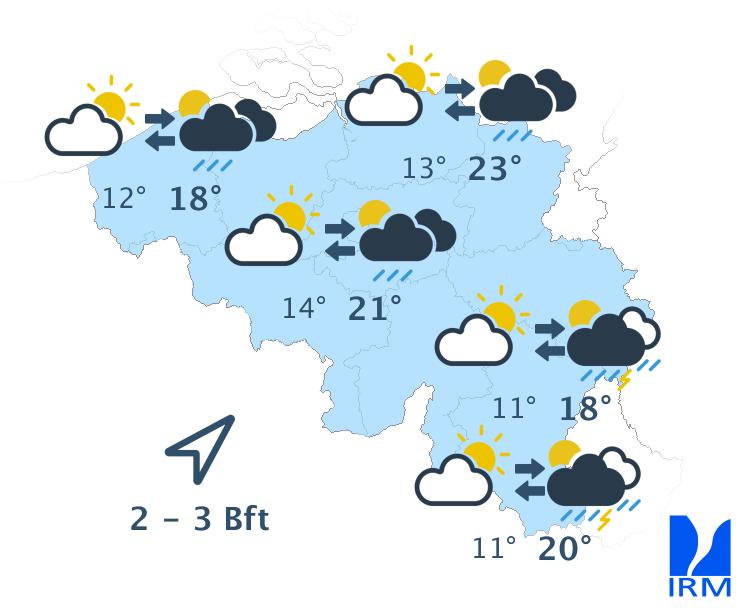 Samedi, en matinée, le temps devrait rester encore ensoleillé mais dans l'après-midi, l'instabilité augmentera depuis la frontière française avec davantage de nuages et risque d'averses (orageuses). Les maxima pourraient encore atteindre 25 degrés dans le centre, voire localement plus. Le vent deviendra faible et variable.