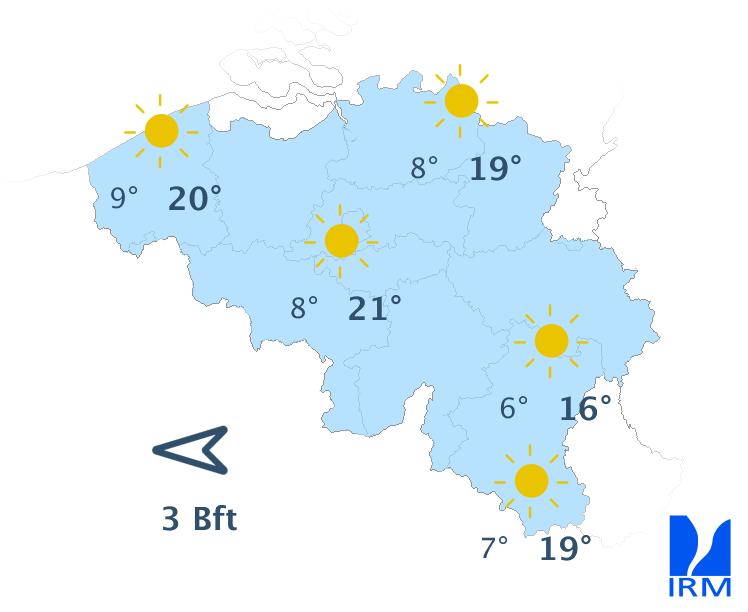 Mercredi, le temps restera sec avec un franc soleil. Les maxima seront compris entre 16 degrés sur les hauteurs de l'Ardenne et 20 ou 21 degrés dans le centre, sous un vent sensible, modéré de secteur est.