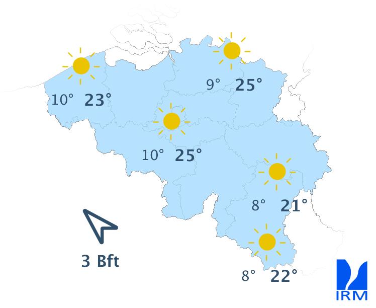 Demain mardi, la journée débutera avec pas mal de nuages et un risque d'une ondée. Ensuite, les éclaircies s'élargiront et le temps deviendra ensoleillé partout. Les maxima se situeront entre 13 degrés en bord de mer et 21 degrés en Lorraine belge et localement dans le centre. Le vent sera modéré de secteur nord-est. Au littoral, il sera plutôt assez fort à fort de nord-nord-est avec des pointes jusqu'à 50 km/h.