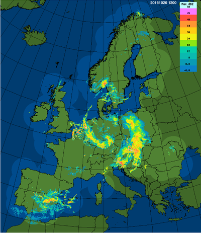 Les radars de l'IRM sont intégrés dans le réseau européen qui compte plus de 200 radars. Les données de ces radars sont collectées en temps réel de manière à former toutes les 15 minutes une image composite radar qui couvre toute l'Europe. Cette image est produite toutes les 15 minutes et permet de suivre l'évolution des précipitations à l'échelle continentale.