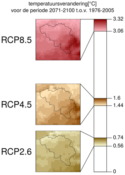 L'impact du changement climatique pour un scénario en particulier est calculé sur base de la différence obtenue entre une projection climatique et la simulation pour la période historique. Les trois prochaines figures montrent la différence pour les températures à 2 m prévues par les trois scénarios, entre les périodes 2071-2100 et 1976-2005. Le scénario le plus optimiste (RCP 2.6), ne prévoit qu’un réchauffement limité à moins de 1 °C. Le scénario le plus pessimiste (RCP 8.5) quant à lui, prévoit un réchauffement de plus de 3 °C en Belgique.