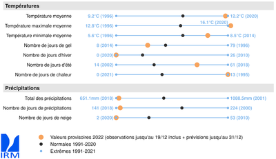 Sur base des prévisions jusqu'au 31 décembre, l'année 2022, avec une température annuelle moyenne de 12,1°C, se classe deuxième dans la liste des années les plus chaudes à Uccle depuis 1833. De plus, les 5 et 10 années les plus chaudes à Uccle se sont toutes produites après 2010 et après 2005, respectivement.