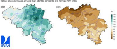 Fig. 2 : Anomalie des quantités annuelles de précipitations par rapport aux valeurs normales : 2024 (à gauche) versus 2025 (observations jusqu’au 18/12/2025) (à droite)