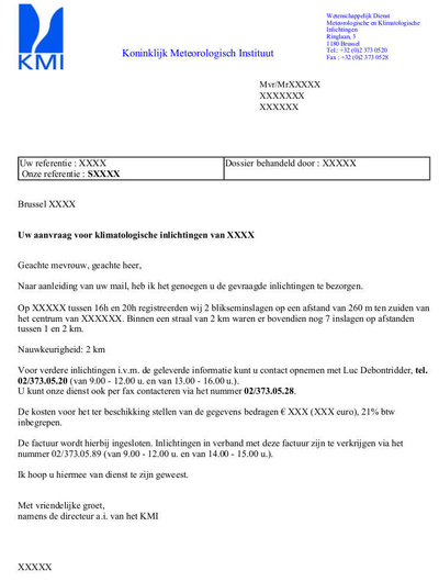 U wilt weten of het al dan niet op een bepaalde plaats en een bepaald tijdstip gebliksemd heeft? Via onze blikseminformatiebrief krijgt u per post een antwoord.