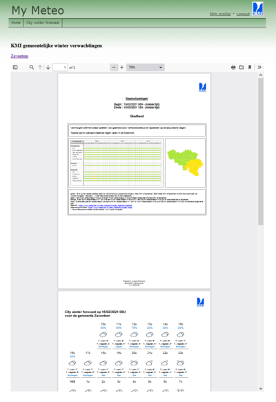 Via een beveiligde webinterface krijgt u toegang tot een document die voor de gekozen gemeente(s) voorspellingen geeft van de luchttemperatuur, de temperatuur van het wegdek, het weertype onder de vorm van een icoon en bijhorende tekst, alsook de kans op neerslag per uur. Deze voorspellingen worden weergegeven voor de komende 48u en worden elk uur geüpdatet.