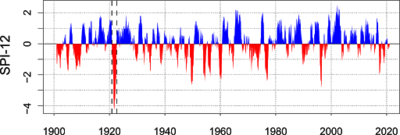 Droogte-index (SPI of gestandaardiseerde regen-index) van 1900 tot 2020 in Ukkel berekend met 12-maandelijkse neerslagwaarden. Negatieve waarden duiden droge perioden aan. De droogte van 1921, aangeduid met verticale lijnen, is veruit de droogste van de tijdreeks.