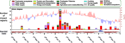 Bovenstaande figuur toont een tijdlijn met zowel de temperatuur en de neerslag in Ukkel, als het aantal droogte-gerelateerde berichtgevingen voor het jaar 1921. De uitzonderlijkheid van de situatie werd reeds op 28 Augustus 1921 erkend (De Standaard):