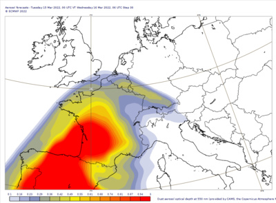 Voorspelling van de aanvoer van warme lucht met Saharastof boven Europa op woensdag 16 maart (Bron: Copernicus Atmosphere Monitoring Service)