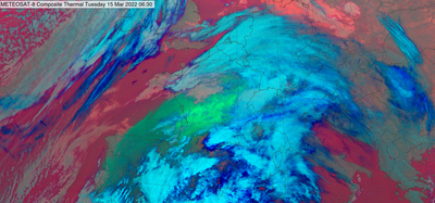 Aangezien deze situatie al even bezig is, bevindt er zich al Saharazand boven Zuidwest-Europa. Dit is zichtbaar op de thermale satellietbeelden. Onze weervoorspellers gebruiken deze beelden vooral om een onderscheid te maken tussen de lage (warmer en meer rood gekleurd) en de hoge wolken (kouder en blauw). Een bijkomend effect van deze satellietbeelden is dat zand in de atmosfeer er geel-groen op kleurt. Deze satellietfoto van vanochtend toont dus duidelijk dat er zich al Saharazand boven Portugal, Spanje en Frankrijk bevindt.