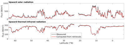 Vergelijking tussen de gemodelleerde (in het rood) en de waargenomen (in het zwart) fluxen door de breedbandradiometer voor een meertperiode van 15 minuten door de satelliet EarthCARE. Bron: ECMWF