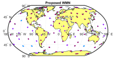 Het door het KMI voorgestelde netwerk omvat 4 nieuwe observatoria op de zeebodem (lichtblauw) en 99 aardse observatoria: 66 observatoria bestaande uit Intermagnet (rood), 12 niet-intermagnetische observatoria (donkerblauw omcirkeld rood) en 21 nieuwe terrestrische observatoria (paars) .