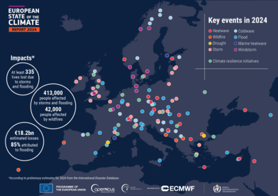 - Temperatuur: 2024 was het warmste jaar voor Europa, met recordhoge jaartemperaturen in bijna de helft van het continent.