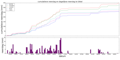 Bovenaan: Cumulatieve neerslag voor Beitem, Dourbes, Humain, Retie en Ukkel. Onderaan: Dagelijkse neerslag in Ukkel voor de periode van 1 januari tot en met 24 mei 2020.
