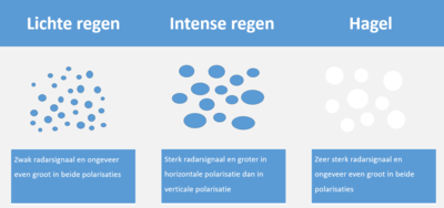 We illustreren dit aan de hand van enkele voorbeelden. Kleine druppels zijn min of meer bolvormig, terwijl grotere druppels afgeplat zijn aan de polen. Grotere druppels zullen dus meer signaal teruggeven in de horizontale polarisatie ten opzichte van de verticale polarisatie, terwijl kleine druppels evenveel signaal geven in de beide polarisaties. Een ander voorbeeld is hagel: hagel geeft in beide polarisaties een sterk signaal, en omdat hagel doorgaans bolvormig is, zal het signaal in beide polarisaties ongeveer even groot zijn. Zo kan er een duidelijk onderscheid worden gemaakt tussen hevige regen (die bestaat uit grote, afgeplatte druppels), en hagel (bolvormig). Dit wordt geïllustreerd in onderstaande figuur. Ook sneeuw kan op een gelijkaardige manier worden onderscheiden van andere neerslagtypes.