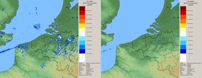 Maar deze informatie over het neerslagtype is niet het enige voordeel van de dubbele polarisatietechniek! Een zeer belangrijk ander voordeel is dat er een betere filtering mogelijk is van niet-meteorologische signalen die onvermijdelijk in de metingen aanwezig zijn. Deze signalen zijn bijvoorbeeld veroorzaakt door grote obstakels op grondniveau (flatgebouwen, windmolenparken, elektriciteitsmasten, containerschepen) of door signalen van biologische oorsprong (vogels, vleermuizen, insecten). Al deze signalen zijn in de dubbele polarisatiegegevens sterk verschillend van de meteorologische signalen. Dankzij de dubbele polarisatietechniek is er dus een zeer effectieve filtering van de radarbeelden mogelijk, zoals geïllustreerd in onderstaande afbeelding.