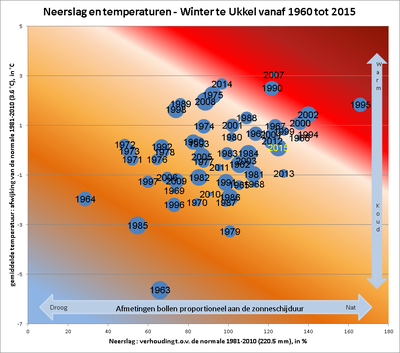 Hieronder vindt U het klimatologisch overzicht van de winter van 2015 (december 2014 tot februari 2015) voor 4 parameters. Tevens wordt deze winter vergeleken met de 5 meest extreme winters voor elke parameter.