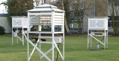 Een voorbeeld van de veranderde meetomstandigheden: in het klimatologisch park in Ukkel worden sinds het einde van de 19de eeuw verschillende types thermometerhutten (halfopen, gesloten) gebruikt.