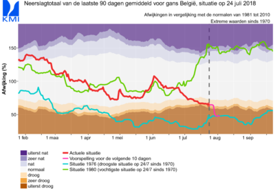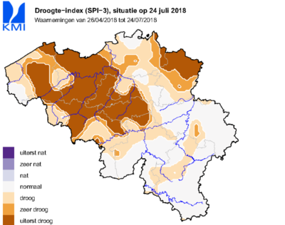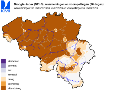 Om te beoordelen in welke mate de gevallen neerslag afwijkt van de normalen, wordt de SPI vaak gebruikt. Actuele en voorspelde waarden van deze droogte-index kunnen worden teruggevonden op onze website. Als men een periode van 90 dagen (SPI-3) aanschouwt, is de in deze periode gevallen neerslag op vele plaatsen uiterst weinig, vooral in de noordelijke landshelft. Maar de grilligheid van de buien zorgt ook hier voor lokale verschillen. Zo is er bijvoorbeeld nog steeds een strook te zien van Sint-Truiden over Diest en Aarschot waar de neerslagsom niet zo veel afwijkt met de normalen dankzij buien die er teisterden op het eind van de maand mei en begin juni.