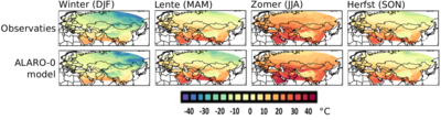 Vergelijking tussen observaties (boven) en modelberekeningen (onder) van de temperatuur voor de periode 1980 -2017 en voor de verschillende seizoenen.