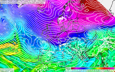 Kaart van de luchtmassa (in kleur) en isobaren (witte lijnen) die de instroom van zeer koude continentale lucht over een groot deel van de noordelijke helft van Europa laat zien. De figuur toont de overwegend anticyclonale zone van Groenland tot Rusland, dat aan de oorsprong ligt van de aanvoer van deze koude lucht vanuit het oosten tot noordoosten, evenals de depressiezone en storingen ter hoogte van de Atlantische Oceaan die naar het zuiden van Europa worden verdreven (bron: ECMWF).