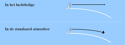 In werkelijkheid volgt een radarstraal geen rechtlijnig traject, maar een licht naar beneden gebogen kromme. Deze afbuiging komt door de breking van de atmosfeer, de variatie van de brekingsindex met de hoogte. Deze variatie hangt af van de wisselende luchtdruk, de temperatuur en de vochtigheid. Bij standaard atmosferische condities volgt de radarstraal een traject dat minder gebogen is dan de aardkromming. De bovenstaande verklaring blijft dus geldig in een standaard atmosfeer.