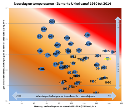 Hieronder vindt U het klimatologisch overzicht van de zomer van 2014 (juni 2014 tot augustus 2014) voor 4 parameters. Tevens wordt deze zomer vergeleken met de 5 meest extreme zomers voor elke parameter.