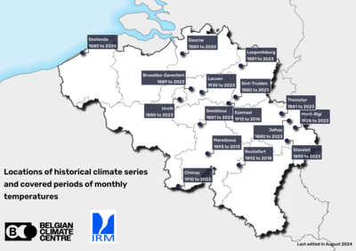 We bieden lange gehomogeniseerde tijdreeksen van maandgemiddelde temperaturen voor 61 stations over heel België.