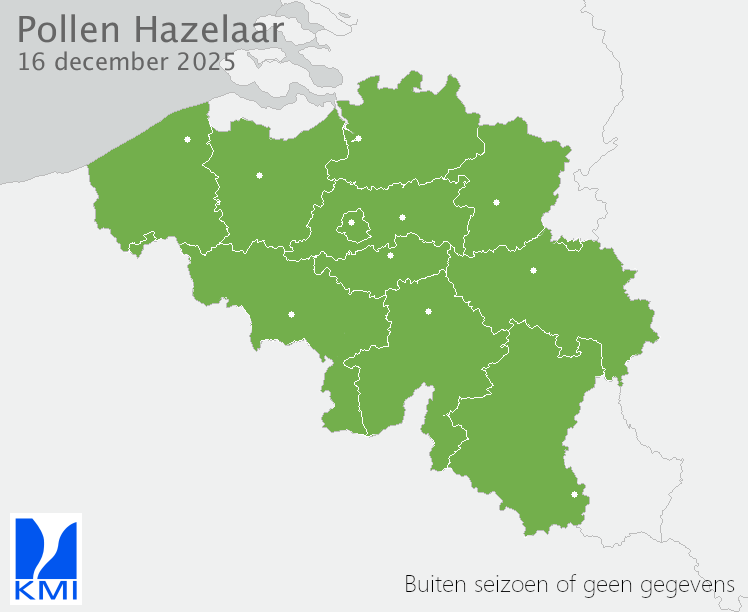 GeenEr wordt geen stuifmeel in de lucht verwacht. Het risico op symptomen is theoretisch afwezig, alhoewel zeer plaatselijke blootstellingen stuifmeelallergieën kunnen veroorzaken.
