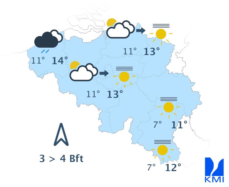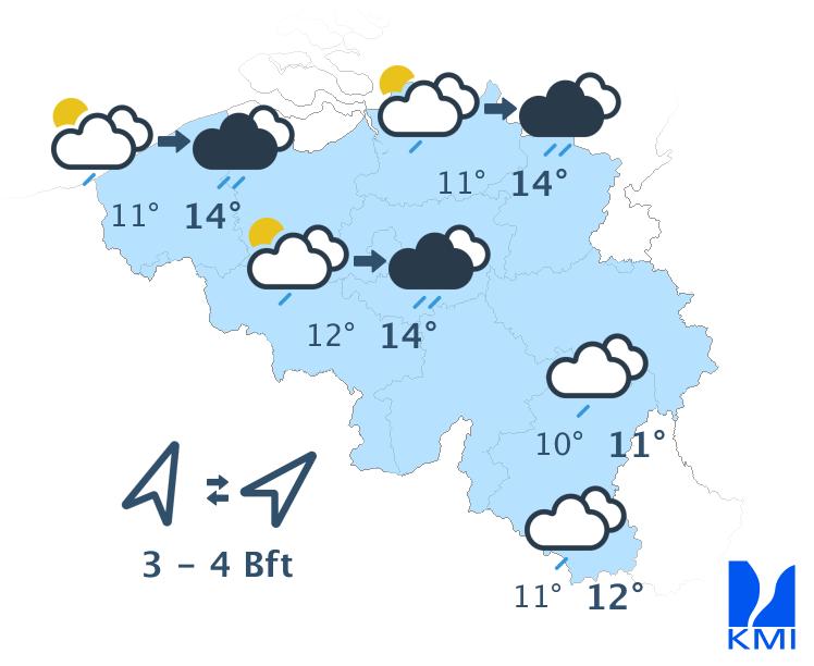 Vrijdag krijgen we meer perioden van regen en buien in Laag- en Midden-België. Ten zuiden van Samber en Maas blijft het overwegend droog met soms zelfs mooie opklaringen. De maxima liggen tussen 12 graden nabij de Nederlandse grens en 17 graden in Belgisch Lotharingen. De wind is zwak tot matig uit oost tot noordoost in het noorden van het land en uit zuid tot zuidoost in het zuiden van het land.