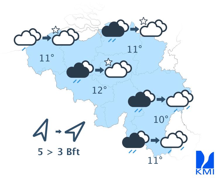 Vanavond worden de opklaringen alsmaar breder. Vannacht wordt het licht tot gedeeltelijk bewolkt met voornamelijk hoge sluierbewolking en in het westen ook wat middelhoge wolkenvelden. De minima liggen tussen 5 en 7 graden in het zuiden van het land en rond 10 à 11 graden in Vlaanderen. De wind is overwegend matig uit zuid tot zuidoost, in het zuidoosten vaak ook zwak.