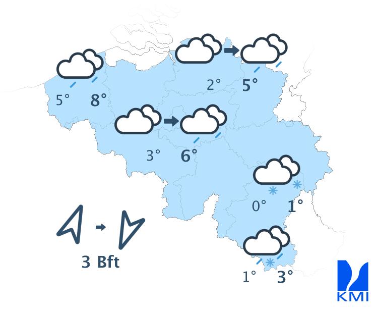 Morgen is het overwegend bewolkt met eerst nog winterse neerslag in de Ardennen. Vervolgens trekken twee structuren met buiige neerslag vanaf de kust over het land. In Laag- en Midden-België valt de neerslag meestal als regen, al is het niet uitgesloten dat een bui links of rechts wat korrelhagel of smeltende sneeuw bevat. Ook een donderslag behoort tot de mogelijkheden. In de Ardennen gaat de regen over in smeltende sneeuw en sneeuw, zodat tegen de avond op de Ardense hoogten (boven 400 m) een sneeuwlaagje van 5 tot 10 cm kan gevormd worden.