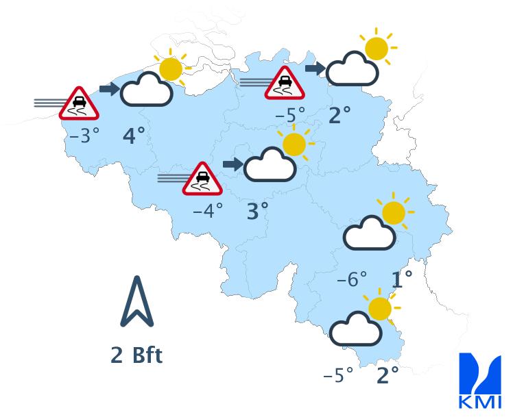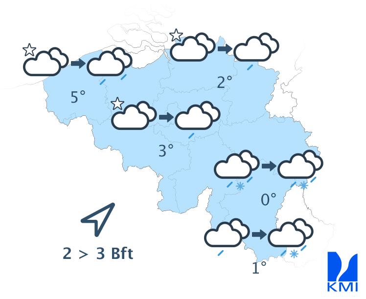 Morgenavond en -nacht is er nog vrij veel bewolking. De laatste sneeuwbuien verlaten de Ardennen en drijven naar Duitsland. Vanaf de Noordzee trekken winterse buien over de westelijke helft van het land. Deze kunnen vergezeld zijn van een paar donderslagen. De minima liggen rond -3 graden in de Hoge Venen, rond +1 graad in het centrum en tussen +3 en +6 graden in de kustregio. De wind waait meestal zwak uit het noorden en krimpt geleidelijk naar zuidwest tot west. Aan zee blijft de wind matig tot vrij krachtig waaien uit het noordwesten.