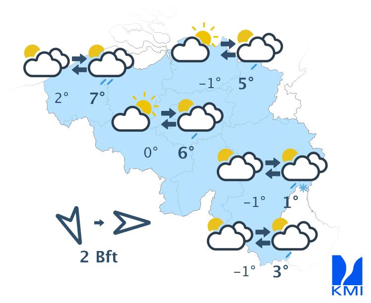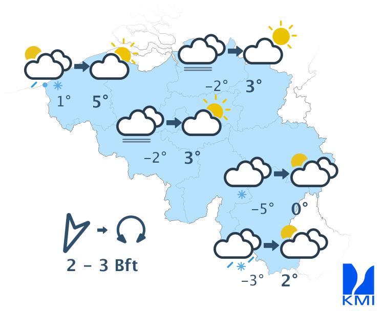 De minima liggen tussen –3 graden in de Hoge Venen en +4 graden aan de kust. In het binnenland waait de wind meestal zwak uit het noorden en ruimt geleidelijk naar het westen. In het noordwesten blijft de wind matig, aan de kust soms vrij krachtig, uit noordwestelijke richtingen.
