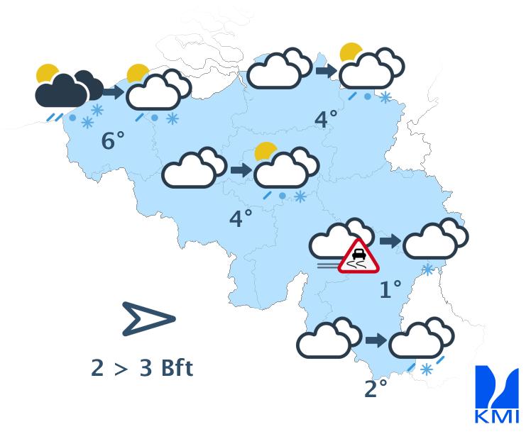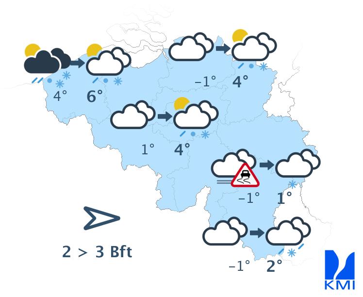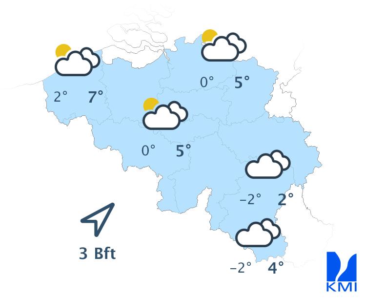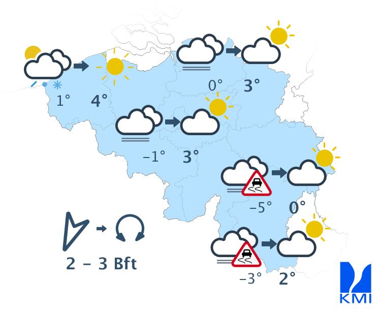 Vrijdag begint de dag meestal grijs met plaatselijk kans op aanvriezende mist in het binnenland. De lage wolken kunnen lokaal nog enkele sneeuwvlokjes opleveren, vooral op de Ardense hoogten. Tegen de middag ontwikkelen zich brede opklaringen in het noorden van het land. In de namiddag breiden deze zich geleidelijk uit naar de andere regio's. De maxima schommelen tussen 0 of -1 graad op de hoogste toppen van de Ardennen en +4 graden aan de kust. De wind waait zwak tot matig uit noordoost.