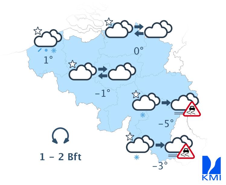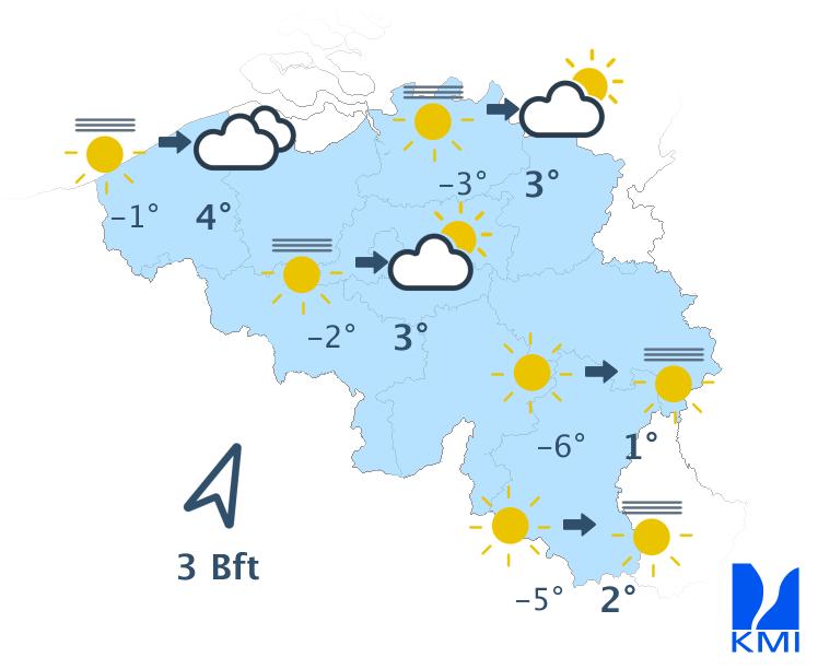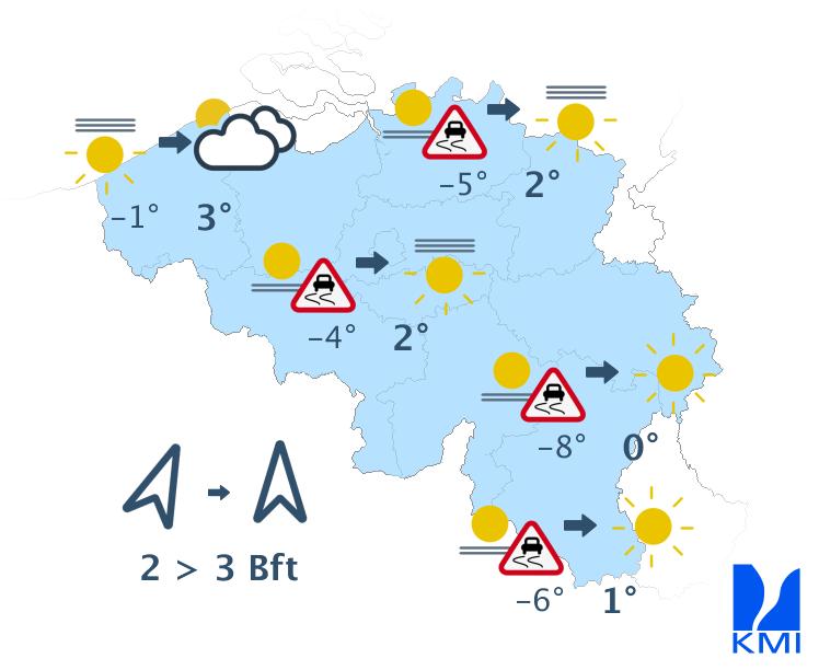 Tijdens de nacht van vrijdag op zaterdag komt het algemeen tot lichte of matige vorst, met minima rond -1 à -2 graden aan de kust en tussen -3 en -9 graden elders, lokaal nog lager in sommige valleien in de Oostkantons.