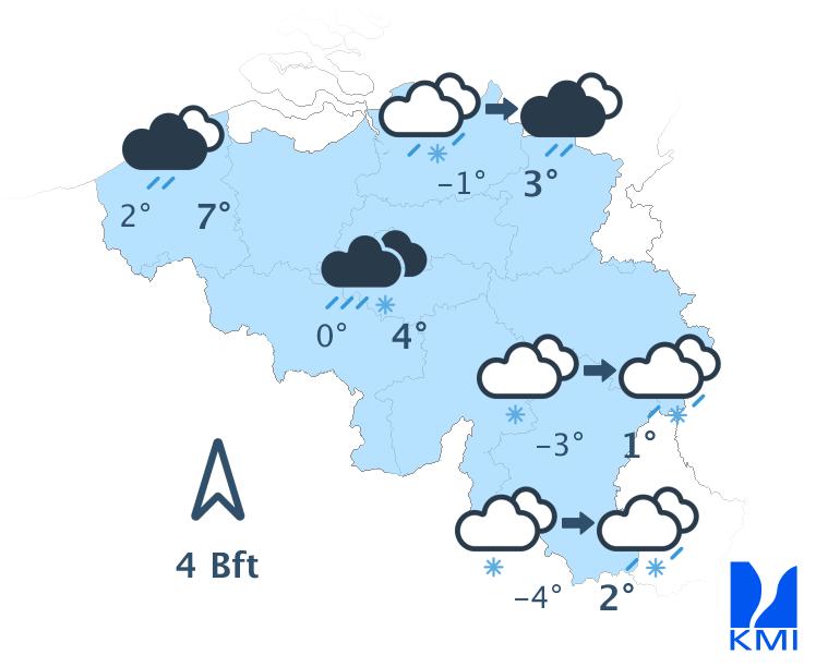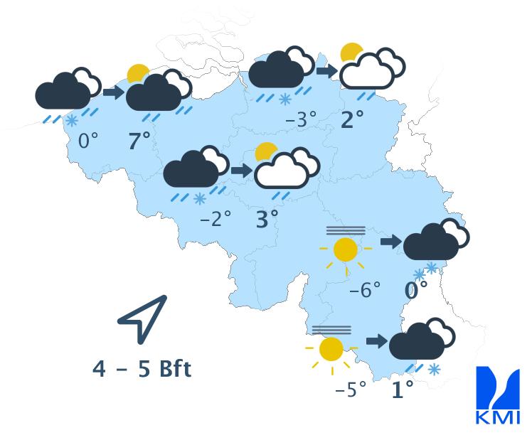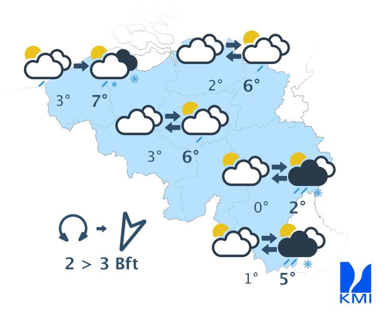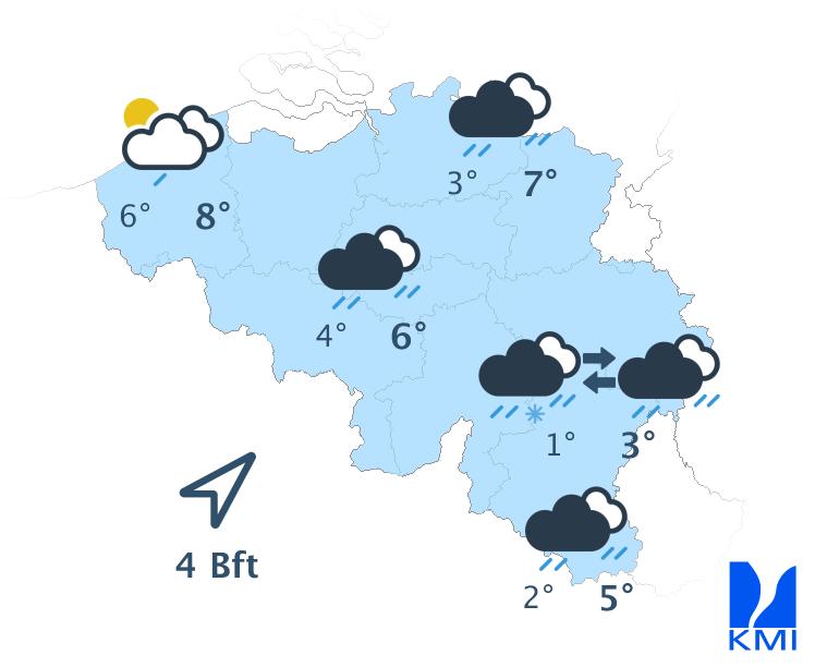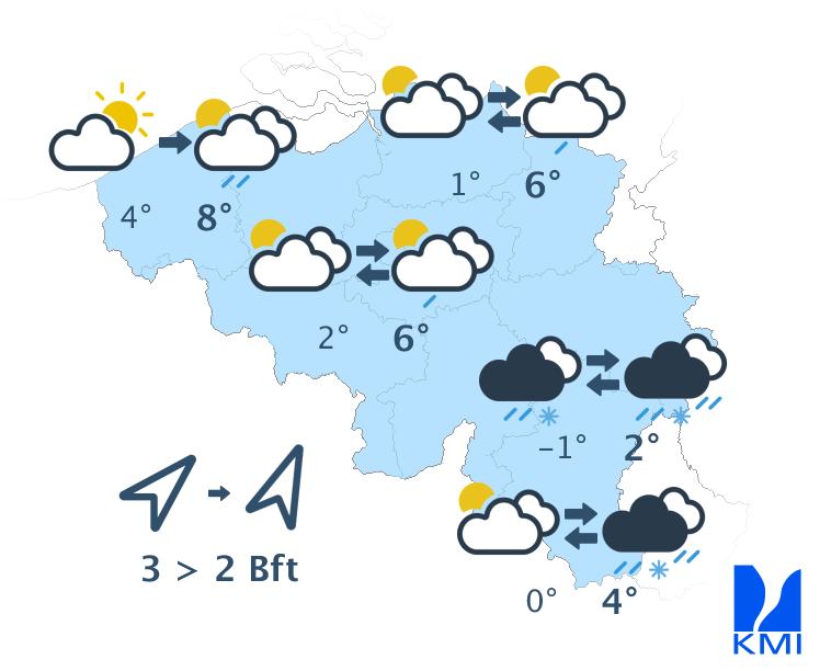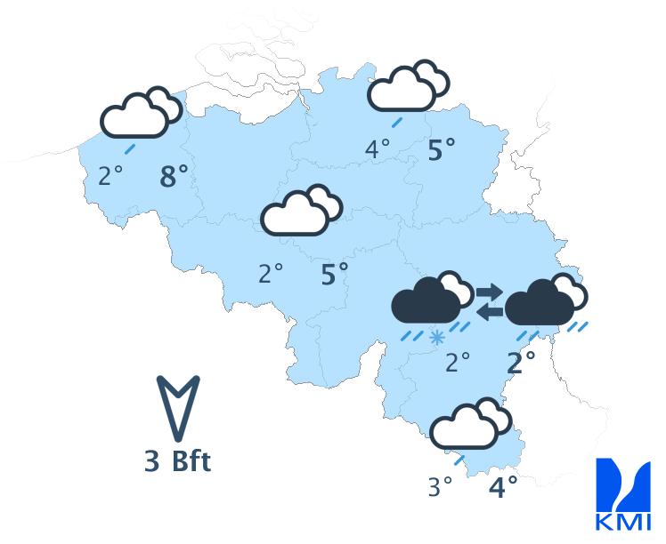 Maandag is het wisselend tot soms zwaarbewolkt met perioden van regen of buien. Eventueel kan de neerslag in de Ardennen nog een winters karakter hebben. De maxima liggen tussen 1 of 2 graden in het reliëf van de Oostkantons en 7 of 8 graden in het westen. De wind waait matig uit het zuidwesten.