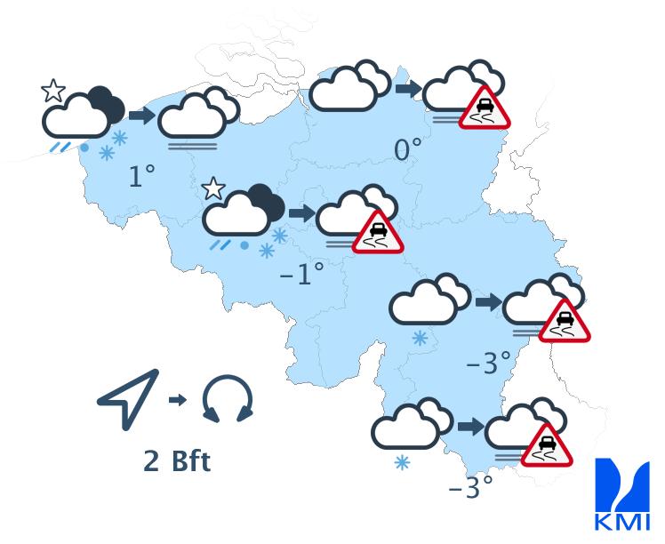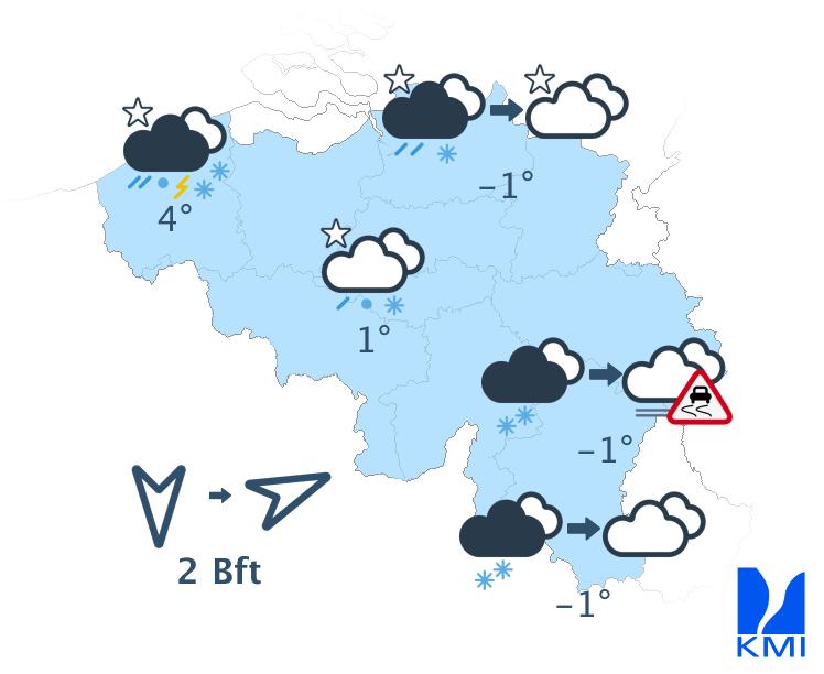 In het eerste gedeelte van de nacht wordt het wisselend bewolkt in het westen en centrum van het land. In het westen zijn er enkele winterse buien, eventueel met een paar donderslagen aan zee. In het zuidoosten blijft het zwaarbewolkt met sneeuw. In het Ardens reliëf kan de zichtbaarheid beperkt zijn. Op het einde van de nacht wordt het droog in het oosten en zuidoosten, terwijl er in het westen en nadien ook het centrum winterse buien blijven zijn, eventueel nog met een donderslag. Tegen de ochtend kan het tijdelijk ook sneeuwen in Laag-België tijdens felle buien. Lokaal en tijdelijk kan er dan ook een sneeuwlaag van enkele cm gevormd worden. De minima liggen tussen -2 graden in de Hoge Venen en +4 graden aan zee. In het binnenland wordt de wind zwak tot matig uit noord tot noordwest, geleidelijk draaiend naar west. Aan zee staat er een vrij krachtige wind die afneemt tot matig uit noordwest.