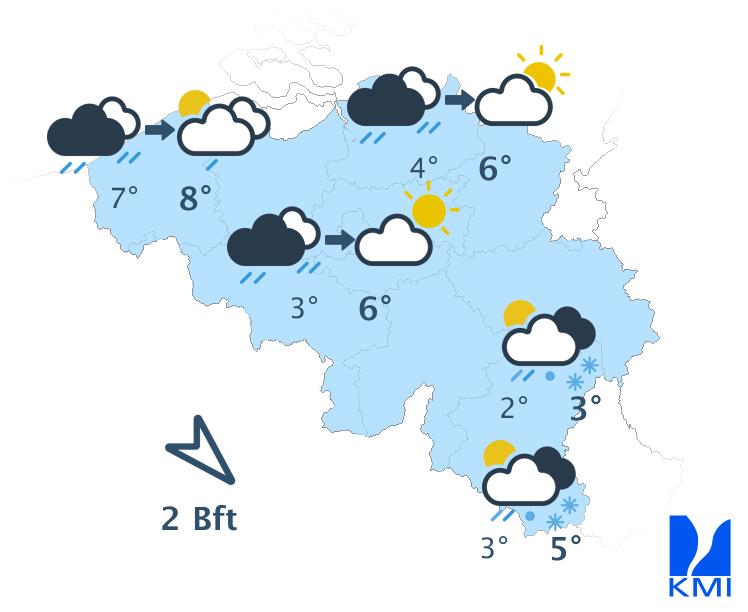 Morgenochtend is het betrokken met eventueel nog een beetje sneeuwval in het centrum. Op het einde van de voormiddag bereikt een nieuwe neerslagzone het westen van het land en in de loop van de namiddag spreidt deze zich uit over heel het grondgebied. Terwijl de neerslag in het westen vooral in de vorm van regen valt, kan deze verder landinwaarts een winters karakter krijgen. In Laag-België verwachten we meestal smeltende sneeuw, maar in de Ardennen kan de eerste neerslag in de vorm van sneeuw vallen. Er is ook kans op aanvriezende regen, vooral in het oosten van het land. De maxima liggen tussen -2 graden in de Hoge Venen en +8 graden aan de westkust. De matige tot vrij krachtige zuidenwind ruimt naar zuidwest en neemt aan zee toe tot krachtig. Er zijn rukwinden mogelijk tussen 60 en 70 km/h.