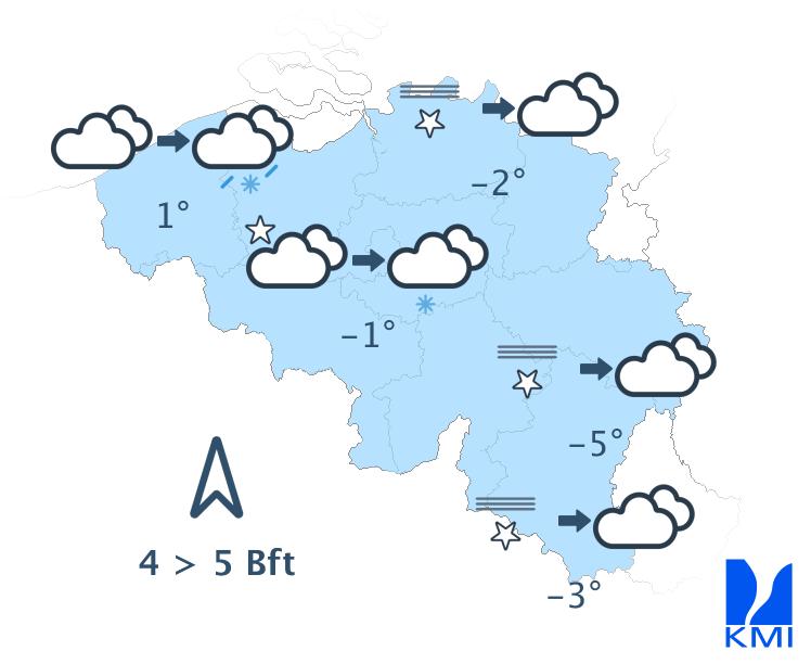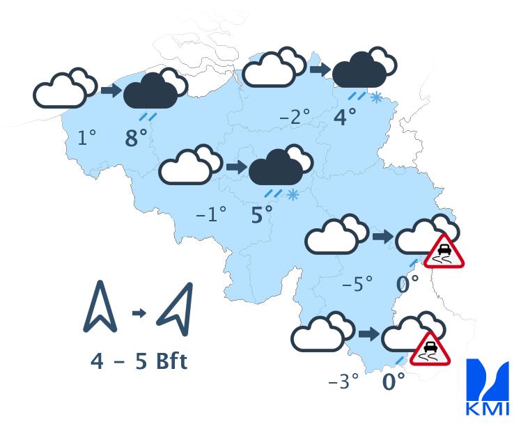 Vanavond blijft de bewolking geleidelijk toenemen. Vannacht bereikt een zone met winterse neerslag het westen van het land, met (smeltende) sneeuw. Ze verplaatst zich langzaam naar het centrum, terwijl de activiteit ervan afneemt. In het oosten zou het zelfs droog moeten blijven. Vooral in het westen kan een tapijtje van enkele centimeters verse sneeuw ontstaan. De minima liggen tussen -7 graden in de Ardennen en 0 graden of +1 graad aan zee. De zuidenwind neemt toe en wordt matig tot vrij krachtig, met rukwinden van ongeveer 50 km/h.